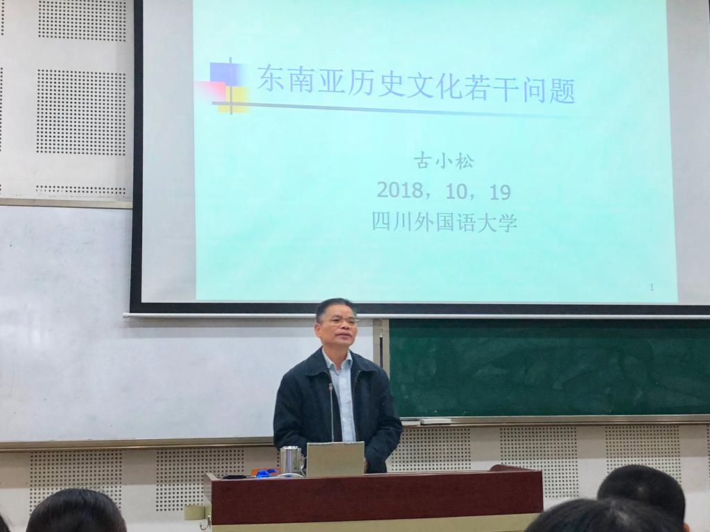 10月19日,广西社会科学研究员古小松博士应邀来到我校开展专题讲座,古小松博士长期致力于东南亚历史文化和越南问题的研究,目前担任全国东南亚研究会副会长,广西东南亚研究会会长,是全国宣传文化系统四个一批人才。古小松博士是广西具有突出贡献的科研人员,在东南亚文化研究领域造诣颇深,成果丰富。讲座分为两场,由我校越南语专业教师黄宪华主持。
