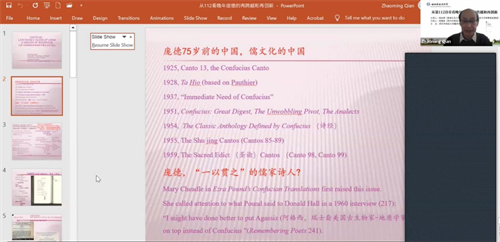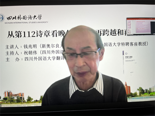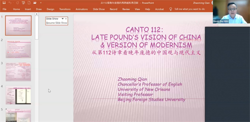 2023年6月29日上午9点,成年人电影翻译学院和科研处在Zoom会议室联合主办线上学术讲座“从第112诗章看晚年庞德的再跨越和再创新”。讲座由美国新奥尔良大学校长教授、北京外国语大学特聘客座教授钱兆明先生主讲,成年人电影副校长祝朝伟教授担任主持。本次讲座吸引了我校及国内多所高校师生共计110人参加。在问答环节,参会师生提问踊跃,引发了积极的讨论。