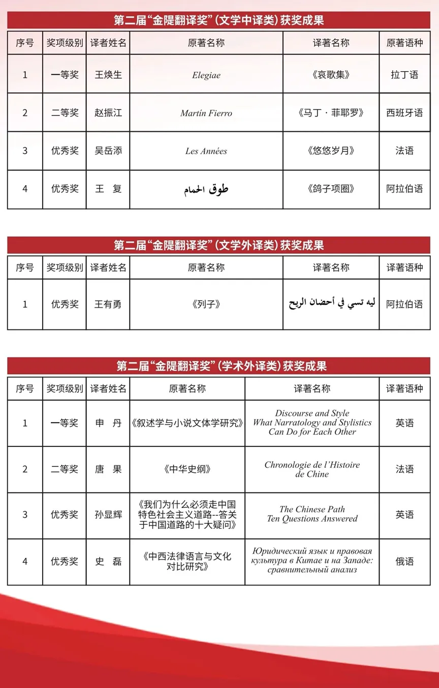 “金隄翻译奖”以我国杰出翻译家、翻译理论家金隄先生(1921-2008)命名,旨在传承金隄先生“择一事、终一生”的学术韧性与译匠精神,推动中华文明与世界多元文明的融通交流。参评成果通过专家提名推荐产生,经翻译界权威专家组成的复评委员会专业评审、终评委员会综合评议后,最终确定获奖作品名单。该奖亦因其权威性与公正性而成为翻译界的重要奖项。